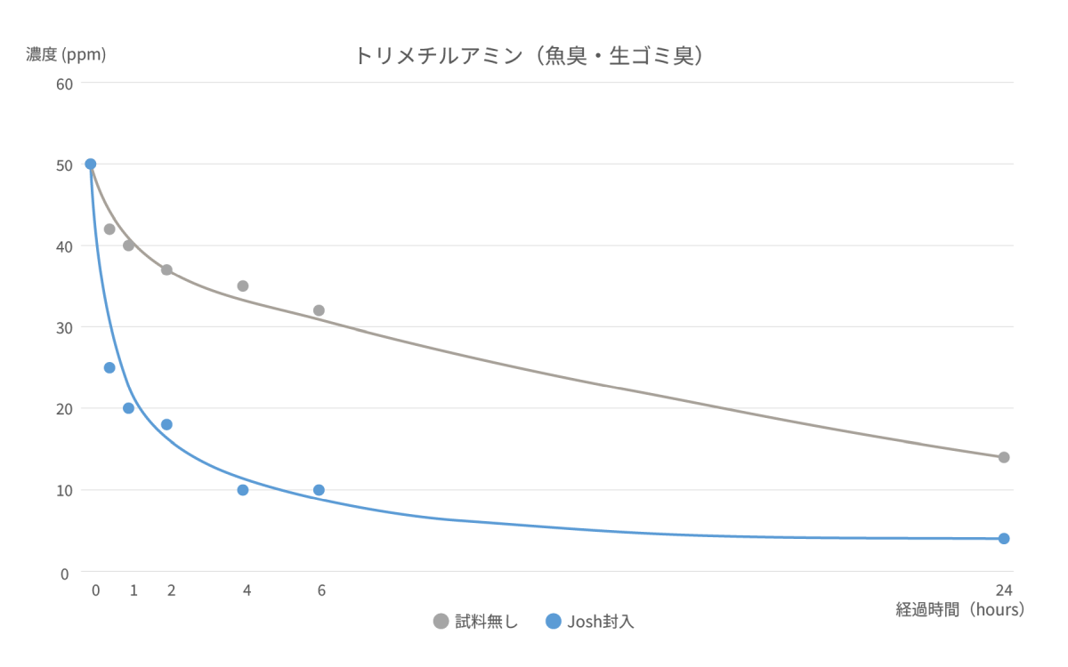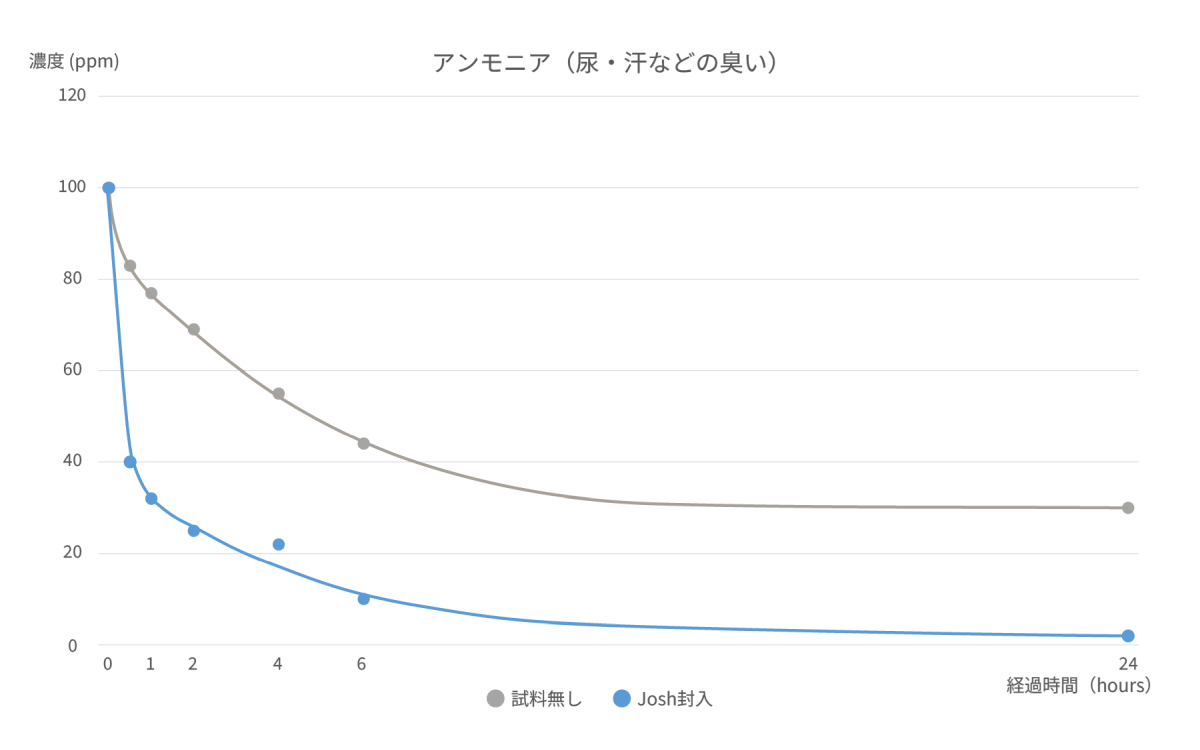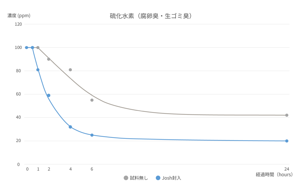 についての実験データです。Josh封入環境下では、ニオイの原因物質が分解され、数値に顕著な差が見られます。(グラフをクリックで拡大表示)(グラフを拡大してご覧ください)